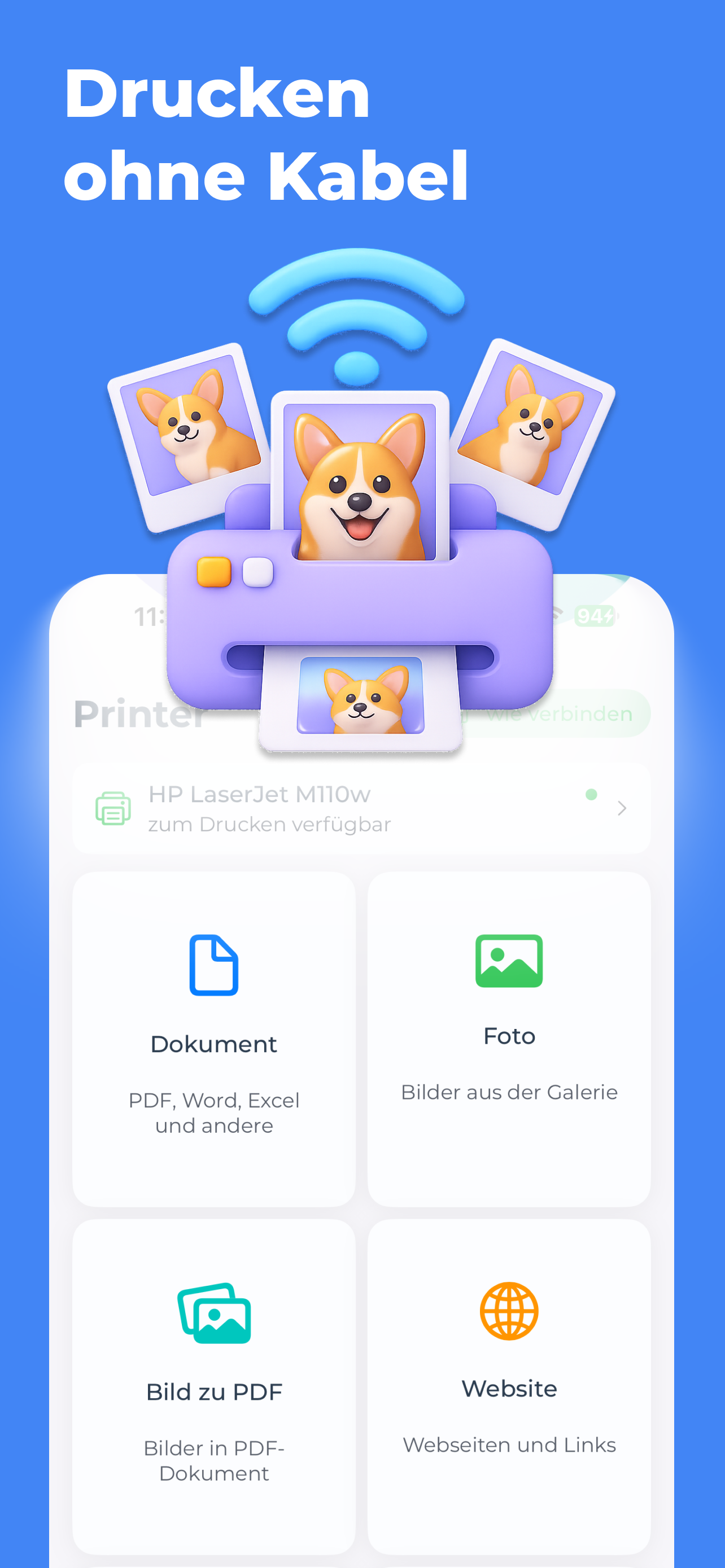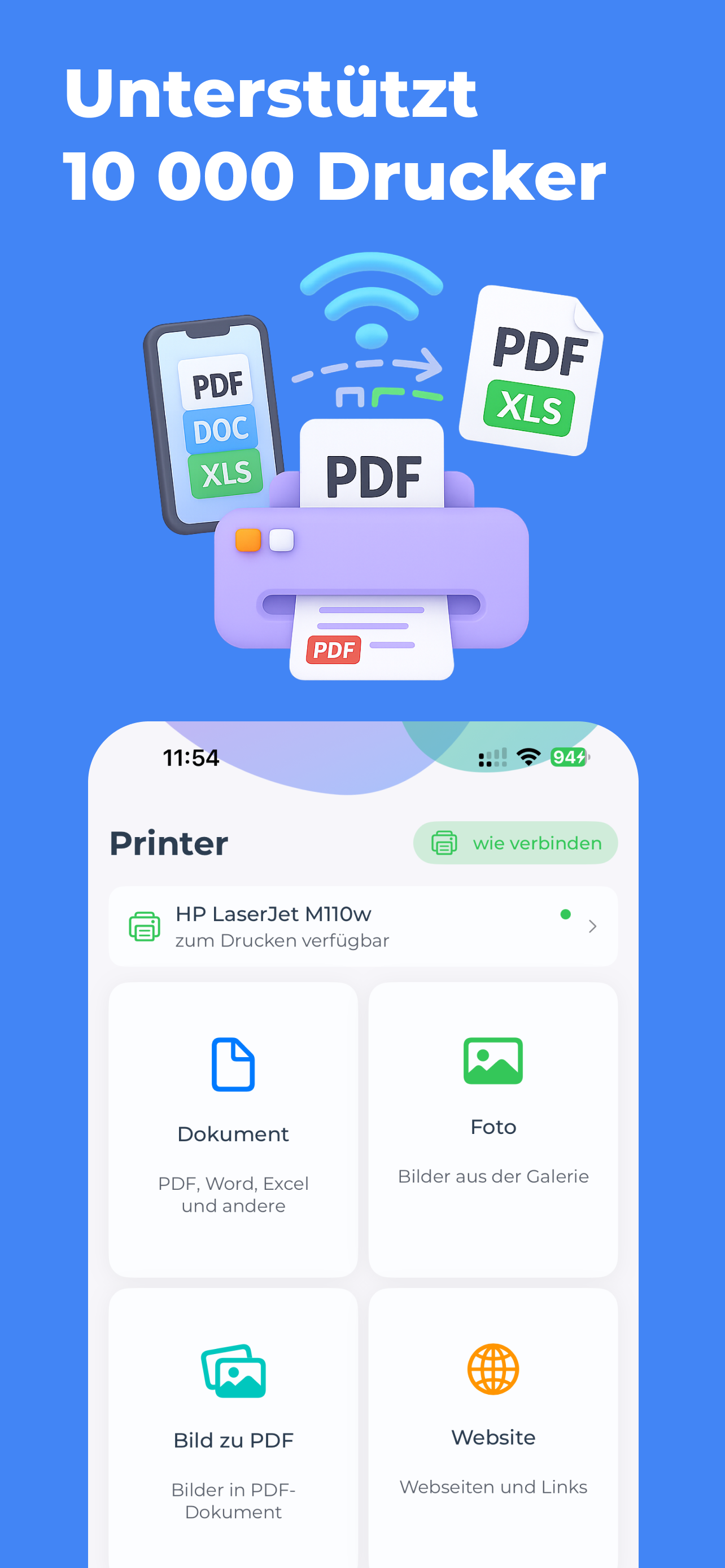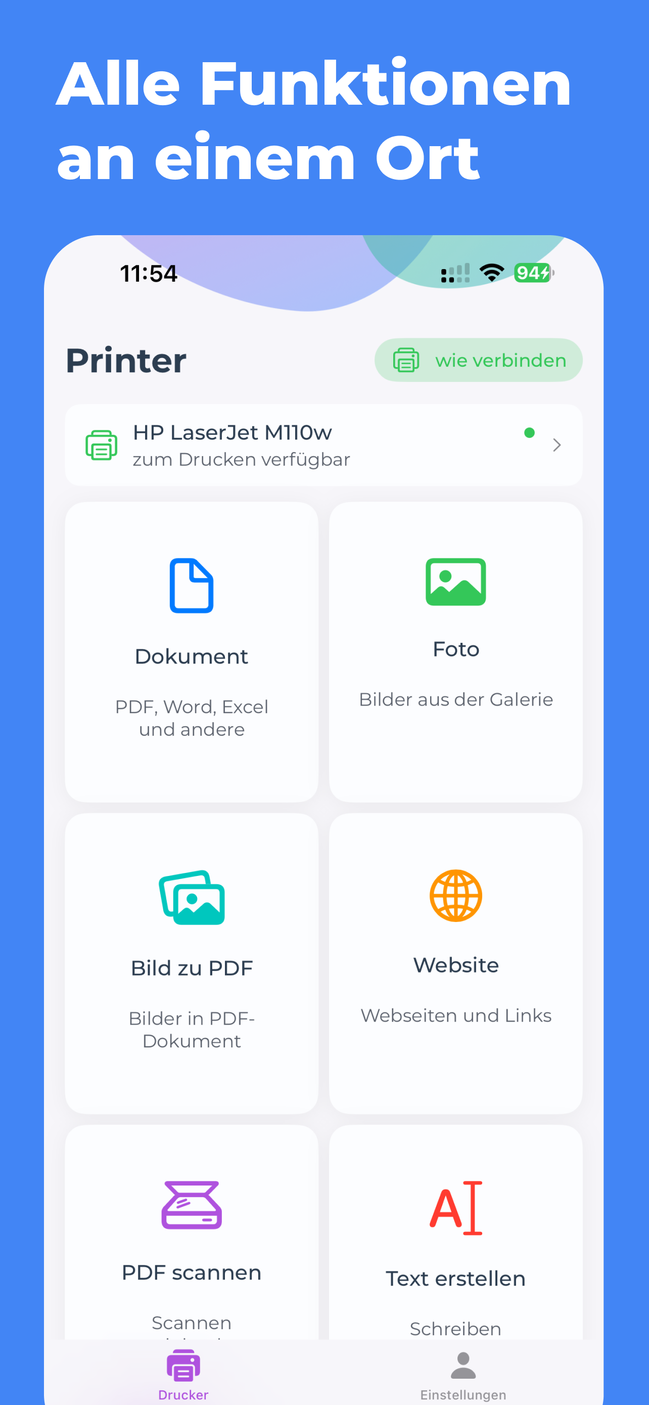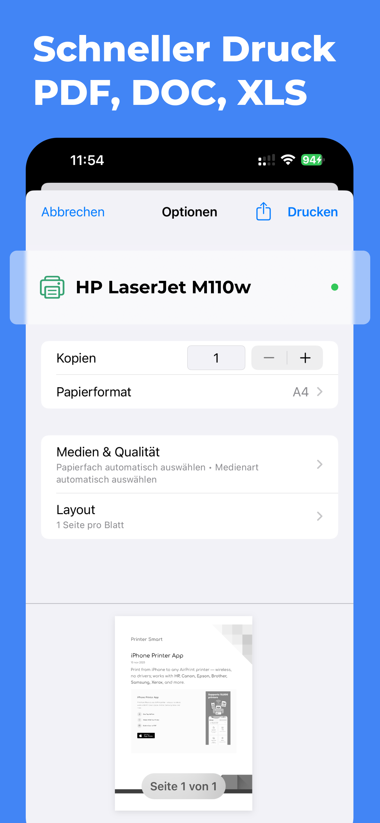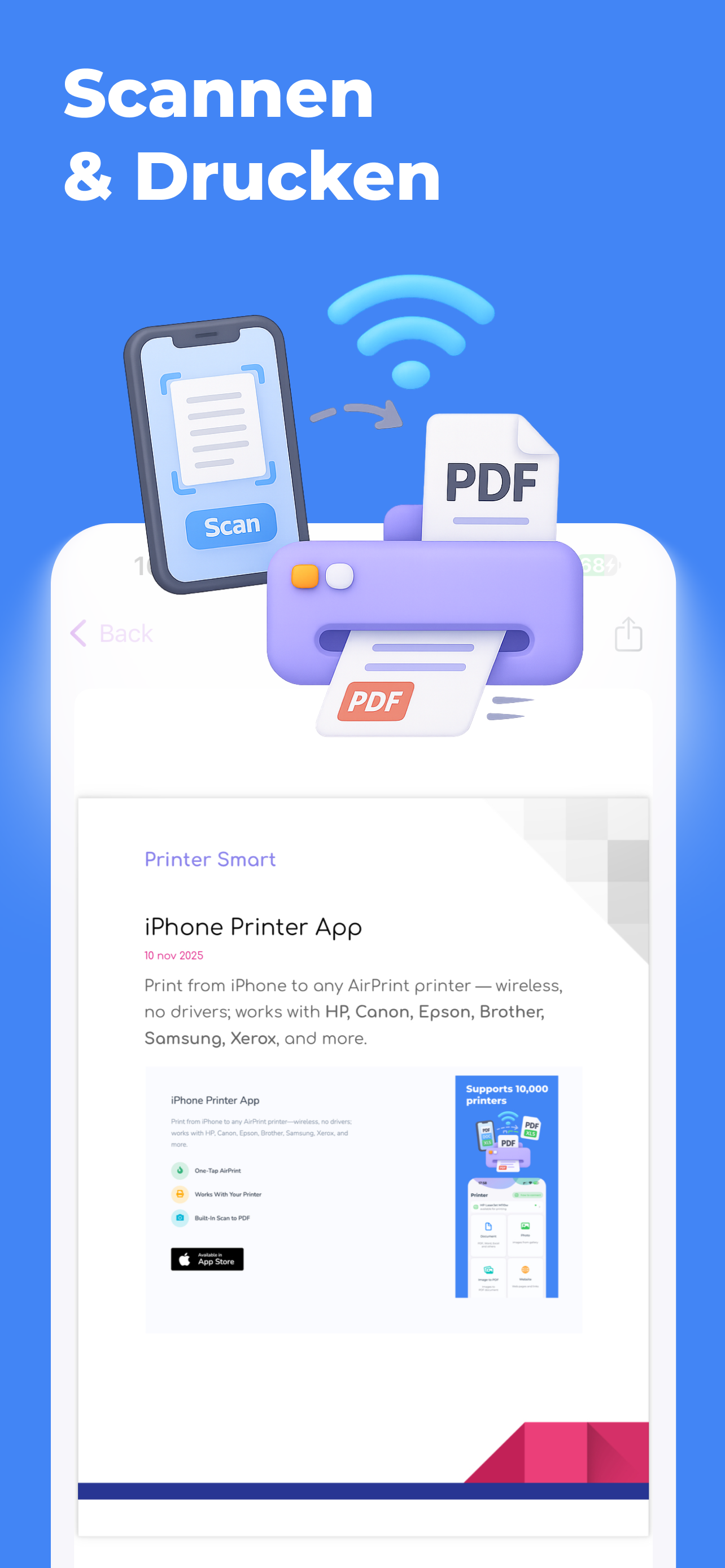 Drucken Sie Dokumente, PDFs, E-Mails und Fotos direkt von Ihrem iPhone auf jeden AirPrint-fähigen Drucker - schnell, kabellos und treiberfrei. Die App erkennt Drucker in Ihrem WLAN-Netzwerk automatisch, unterstützt Duplexdruck und verschiedene Papierformate und enthält ein integriertes Scan-to-PDF-Tool, mit dem Sie in Sekunden erfassen, speichern und drucken können.