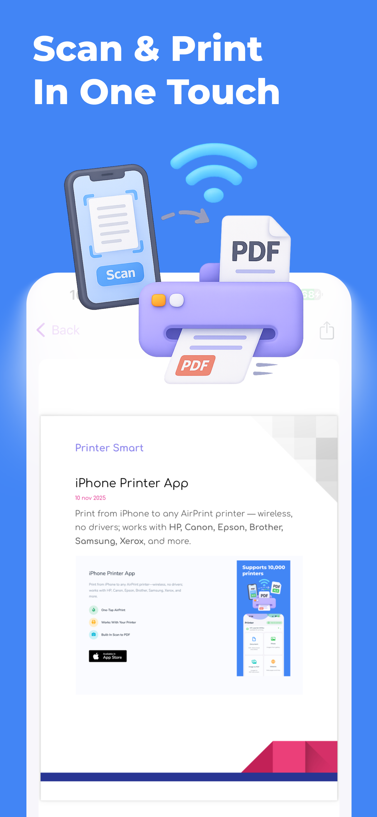 Seamless with leading brands: HP, Canon, Epson, Brother (and more AirPrint models). Just connect to the same Wi-Fi and start printing.