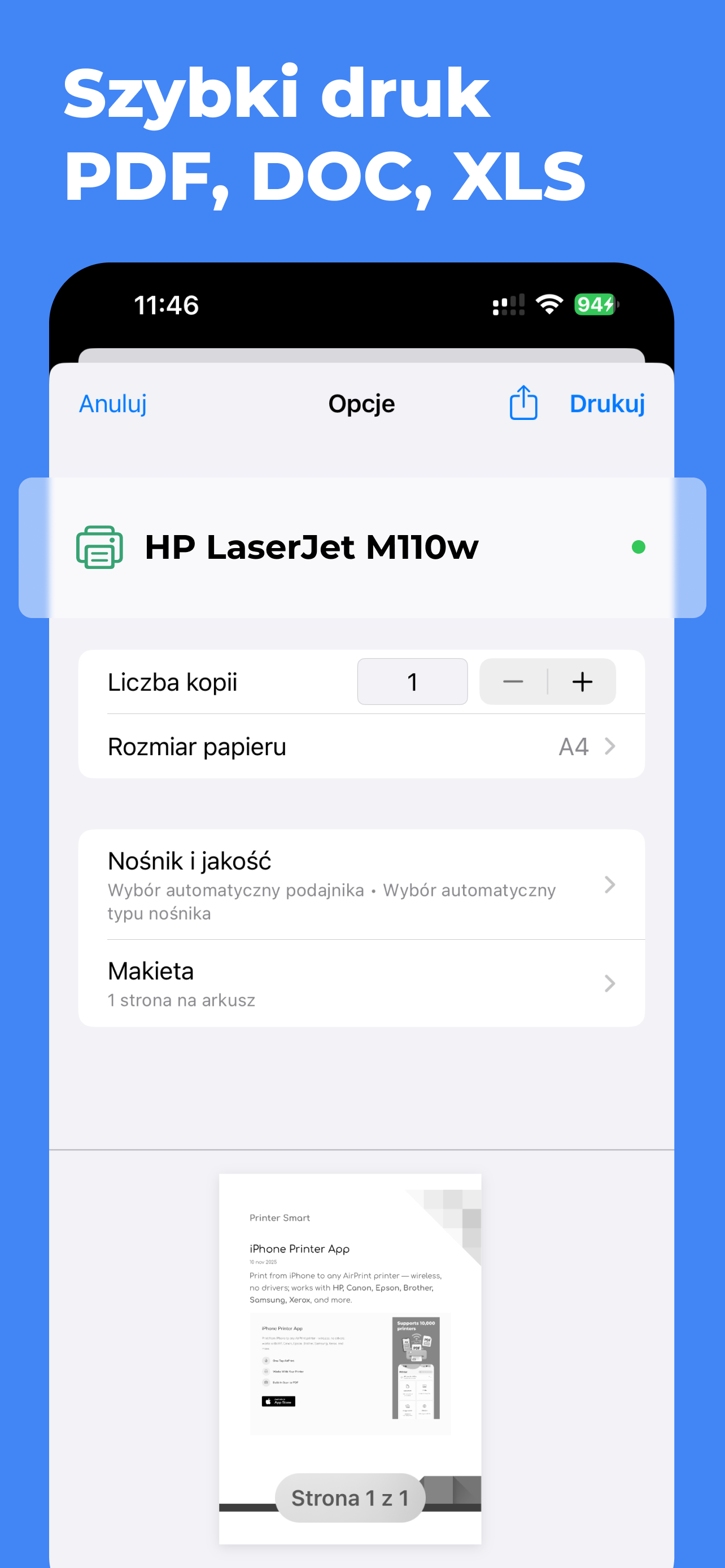 Drukuj z iPhone'a na dowolnej drukarce AirPrint - bezprzewodowo, bez sterowników; działa z HP, Canon, Epson, Brother, Samsung, Xerox i innymi.
