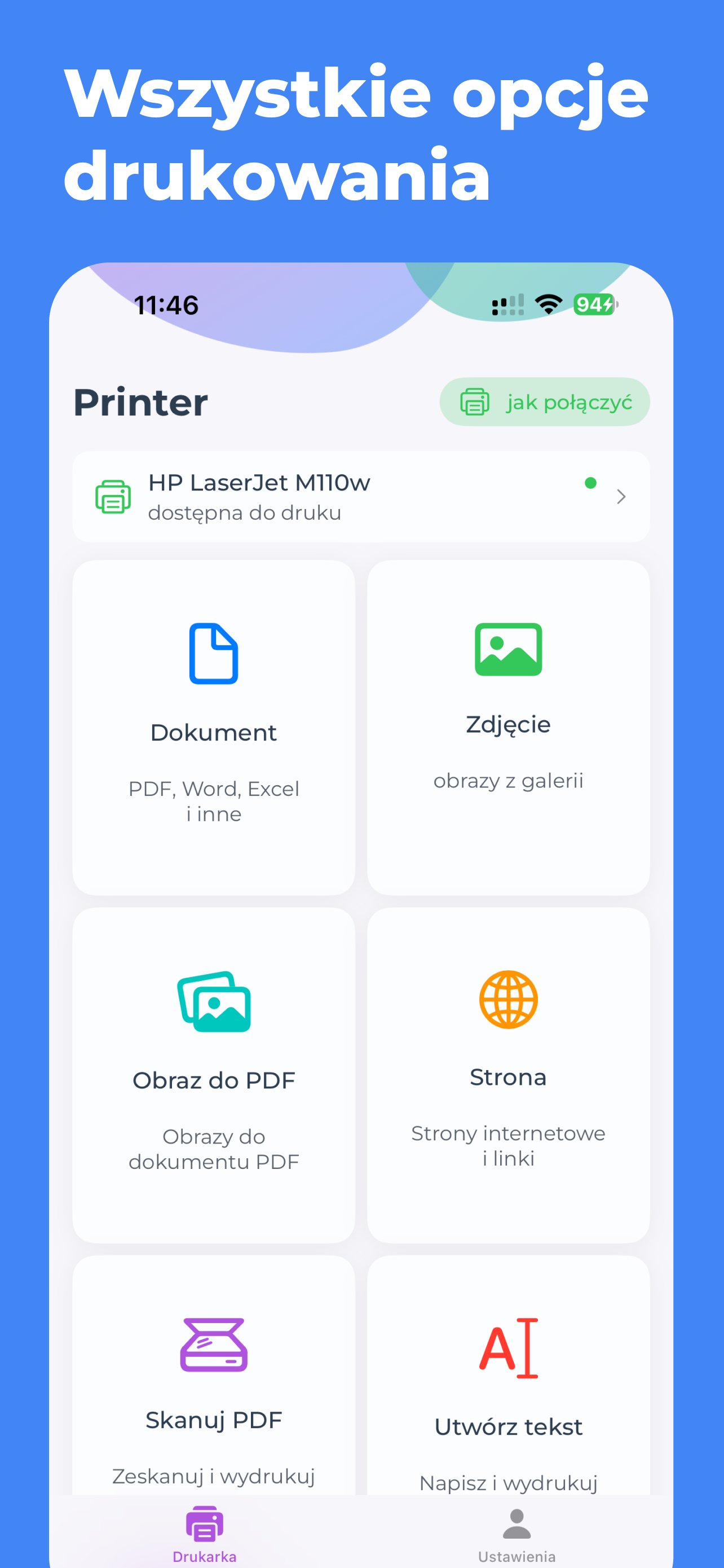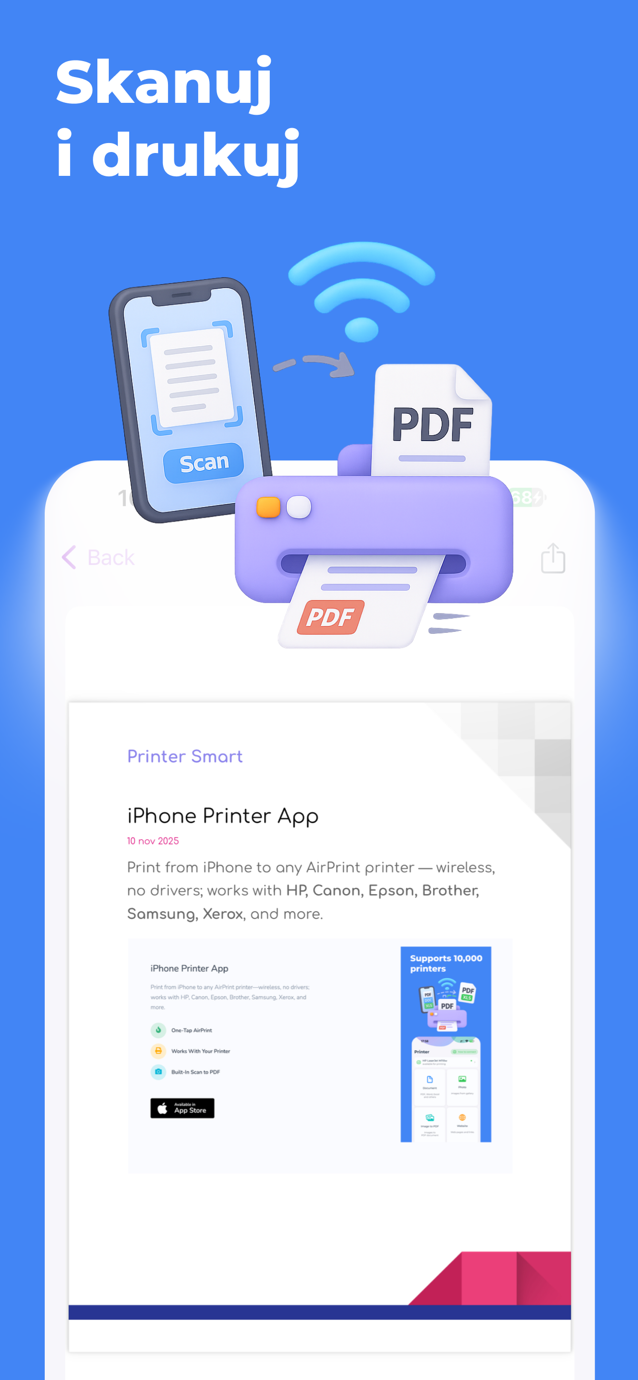 Drukuj dokumenty, pliki PDF, e-maile i zdjęcia bezpośrednio z iPhone'a na każdej drukarce obsługującej AirPrint — szybko, bezprzewodowo i bez sterowników. Aplikacja automatycznie wykrywa drukarki w Twojej sieci Wi-Fi, obsługuje druk dwustronny i różne rozmiary papieru, a także zawiera wbudowane narzędzie Skanowanie do PDF, dzięki któremu możesz przechwytywać, zapisywać i drukować w ciągu sekund.