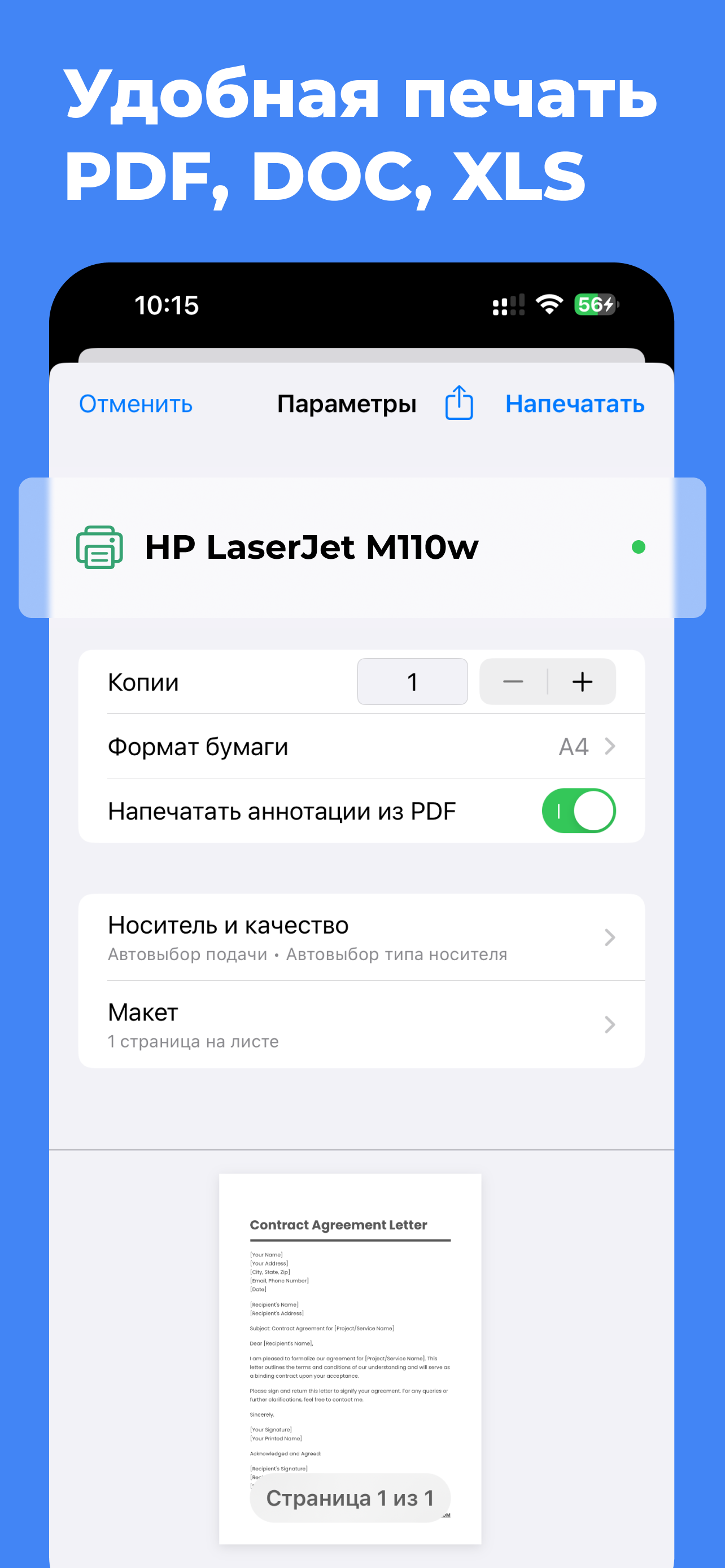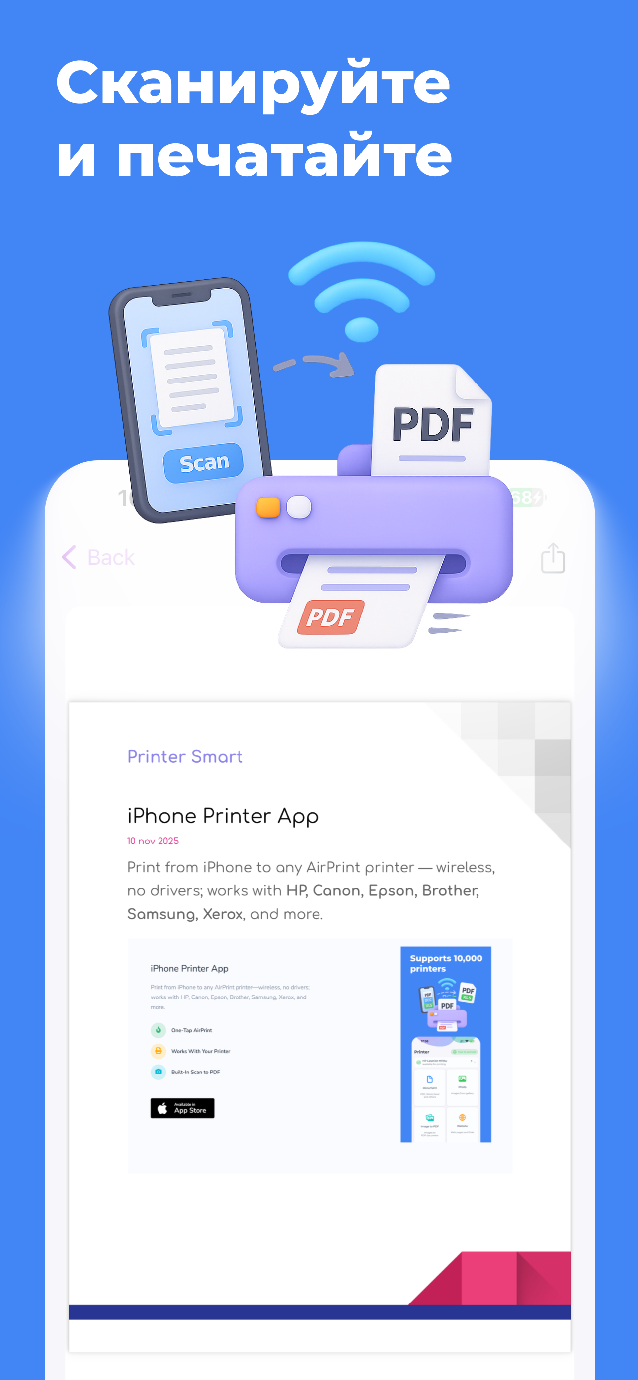 Печатайте с iPhone на любом принтере с поддержкой AirPrint - беспроводная печать, без драйверов; работает с HP, Canon, Epson, Brother, Samsung, Xerox и другими.