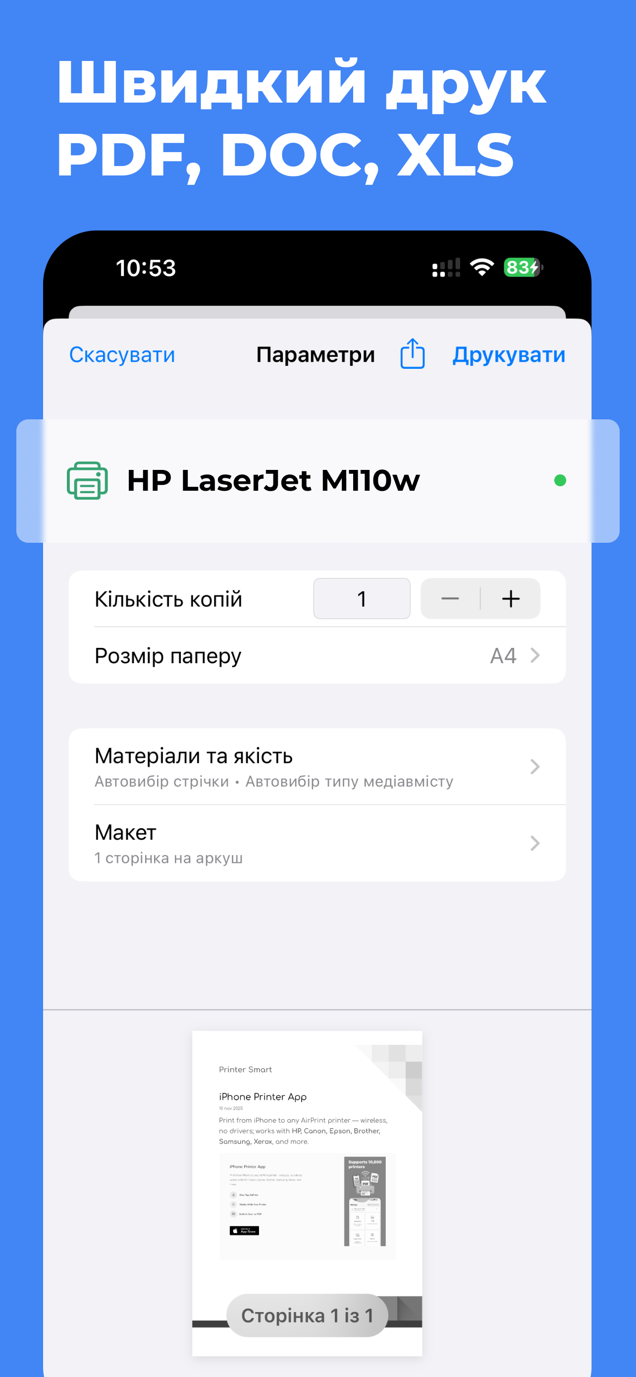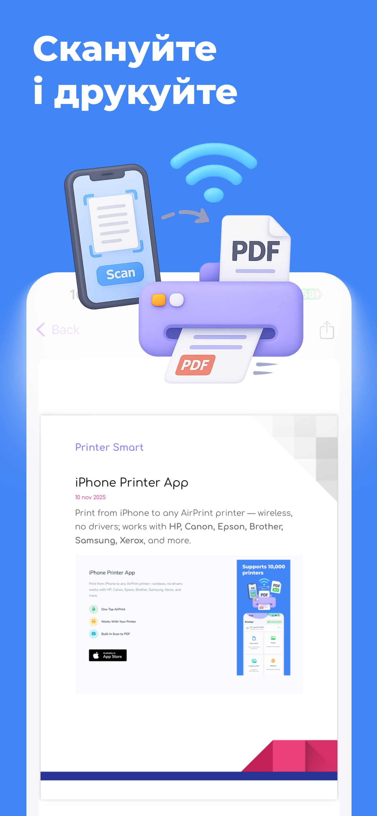 Друкуйте з iPhone на будь-який принтер AirPrint — бездротово, без драйверів; працює з HP, Canon, Epson, Brother, Samsung, Xerox та іншими.